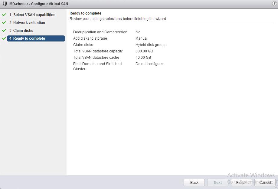 Review the Virtual SAN settings. So I am configuring Hybrid disks groups with 10 GB flash and 200 GB capacity tier from each ESXi hosts. Click on Finish to create the VMware Virtual SAN cluster.