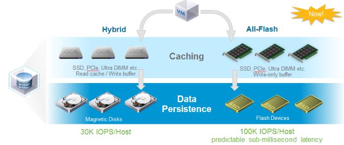There are 2 Modes in which VMWare Virtual SAN can operate. Which is Hybrid or All-Flash. With All-Flash, SSD’s are no longer just used for read caching and write buffering, they can now be used as primary storage as well in an All-Flash mode. The traditional model of magnetic hard disks and SSD’s is now referred to as Hybrid Mode. In Hybrid mode the SSDs function only as a read cache and write buffer as they did in vSphere 5.5, persistent data cannot be written to the SSD tier in Hybrid Mode.