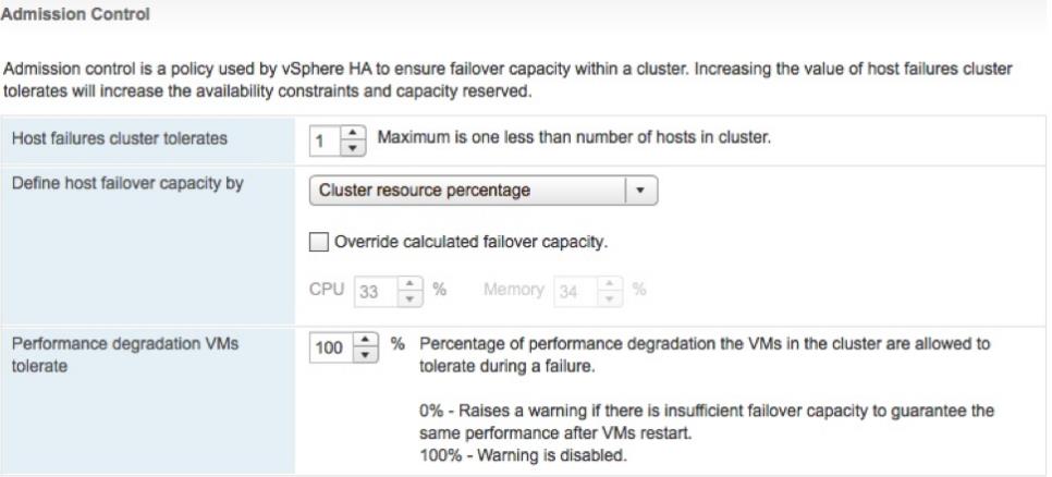 Cluster Resource Percentage : Simply define the Number of ESXi hosts tolerate for failures. vSphere HA will automatically calculate a percentage of resources to set aside by applying the “Percentage of Cluster Resources” admission control policy. It is automatically recalculated, if you have added or removed ESXi hosts in the cluster.