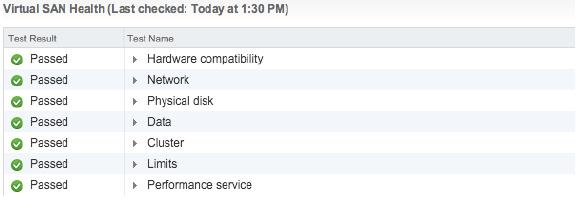 Virtual SAN 6.2 features an improved health service. The health service actively tests and monitors a number of items such as hardware compatibility, network connectivity, cluster health, and capacity consumption. The performance service provides various metrics such as throughput, IOPs, and latency. The health service is enabled by default and configured to check the health of the Virtual SAN environment every 60 minutes.