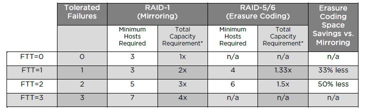 - Uses x1.33 rather than x2 capacity when compared to RAID-1 (Using RAID-5, the parity data only requires 1.33 times.RAID-1 always consumed double additional space (2x). As a result a VM that is 20GB in size will only consume an additional 7GB on other hosts with RAID-5, with RAID-1 it would consume 20GB as you are writing an entire copy of the entire VM to other hosts.)