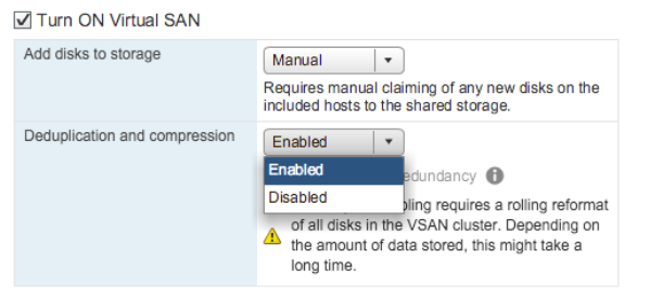 Virtual SAN 6.2 adds greater abilities around lower cost and improving management and monitoring for the most demanding customer storage environments. In this new release, VMware continues to focus on providing a reliable and consistent storage environment for the biggest business critical applications. VMware is expanding the capabilities of Virtual SAN as a platform and is introducing better data efficiency features by delivering deduplication and compression of data as well as providing RAID-5/RAID-6 support for all flash Virtual SAN environment.