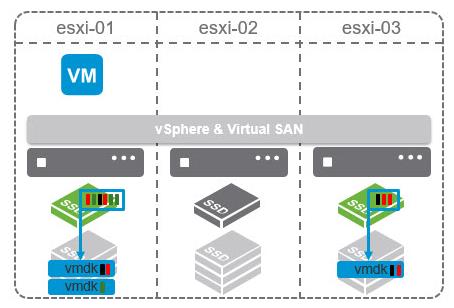 Write through read memory cache which is “local” to a VM. Brings only very low overhead but has a big impact on performance (especially for VDI). A dynamic memory, taking up to 1Gb from each host. Compared to VSAN 6.1, the client cache will use 4% of host memory up to 1GB of host memory.Note that this in-memory cache is a client side cache, meaning that the blocks of a VM are cached on the host where the VM is located.