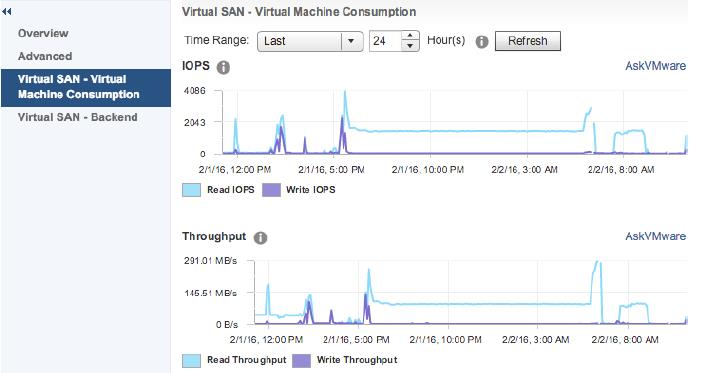 Virtual SAN 6.2 features an improved health service. The health service actively tests and monitors a number of items such as hardware compatibility, network connectivity, cluster health, and capacity consumption. The performance service provides various metrics such as throughput, IOPs, and latency. The health service is enabled by default and configured to check the health of the Virtual SAN environment every 60 minutes.