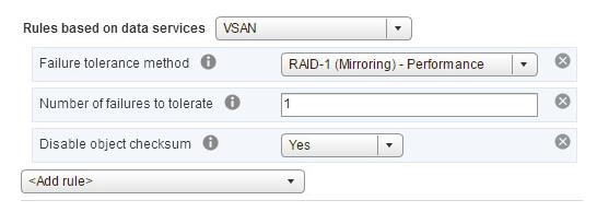 In the previous version of VSAN, Datasore deployed were either as a RAID-0 (stripe) or a RAID-1 (mirror) or a combination of both. This is an overhead in terms of capacity perspective because if you want you VM to tolerate 1 failure, you need 2 copies of data. similarly, If you want VM to tolerate number of failures to 2, you need 4 copies of data stored on VSAN datastore.In VSAN 6.2, some new configurations, namely RAID-5 and RAID-6 are introduced to help reduce the overhead when configuring virtual machines to tolerate failures on VSAN. This feature is also termed “erasure coding”.